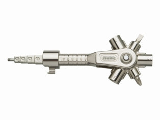 Multifunktioneller Universalschlüssel für alle Baufachleute, Architekten und Handwerker. Aussenvierkant SW 7 + 8 mm, Aussendreikant Grösse 8 mm, Schraubeneinsatz PZ 2, Schraubeneinsatz Schlitz 3 mm, Heizentlüftungs-Vierkant SW 5 mm, Messskala bis 40 mm, Rundzylinder-Mitnehmer Nenn-Ø 22 mm, Flaschenöffner am Mitnehmer, Innen-Vierkant SW 7 / 8 / 9 / 10 mm, Innen-6-kt SW 3 mm