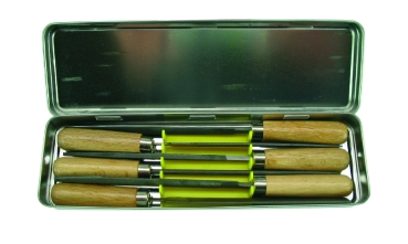 6-tlg., je 1 Feile 100 mm mit Heft, Hieb 2, flachstumpf, halbrund, dreikant, 4-kant, rund, flachspitz in Blechschachtel