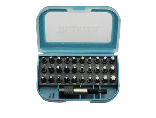 Setinhalt: Bits 25 mm: 2x PH1, 4x PH2, 2x PH3, 2x PZ1, 4x PZ2, 2x PZ3, 1x T8, 2x T10, 2x T15, 2x T20, 3x T25, 1x T27, 2x T30, 1x T40, 1x Bithalter mit Schnellwechselfutter 1/4".