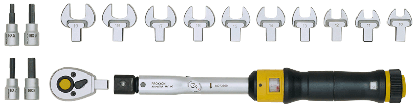 Aufsteckwerkzeuge mit Einsteck-Vierkant (9 x 12 mm) zum Verrasten mit Federstift: 10 Gabelschlüssel, aus CrV-Stahl geschmiedet, in SW 10 - 11 - 12 - 13 - 14 - 15 - 16 - 17 - 18 und 19 mm. Der Kopf mit Ratschenmechanismus und 3/8" (10 mm) -Vierkant (umsteckbar für Linksgewinde) macht den MC 60-Multi zum normalen Drehmomentschlüssel für Steckschlüsseleinsätze. Dazu 4 Schraubereinsätze HX 5 - 6 - 7 und 8 mm mit Klingen aus Chrom-Silicium-Mangan-Molybdän legiertem Spezialstahl.