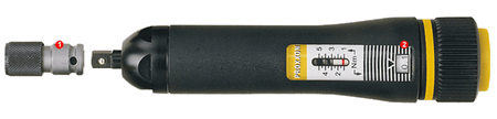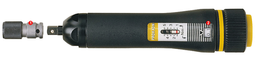 Einstellen des Drehmomentes durch Drehen des gerändelten Ringes am Griffende. Durch Einschub des Ringes wird der gewählte Wert fixiert. Gut lesbare Fensterskala. Zusätzliche Mikro-Skala zur Feinjustierung: 1 Drehung = 1,0 Nm. Skalenring mit 0,10 Nm-Teilung. Mit 1/4"-Vierkant (6,3 mm) für Steckschlüsseleinsätze und aufsteckbaren Adapter mit Federhülse zur formschlüssigen Haltung von 1/4"-Standardbits (6,3 mm). Genauigkeit +/- 6%. Gesamtlänge 165 mm.