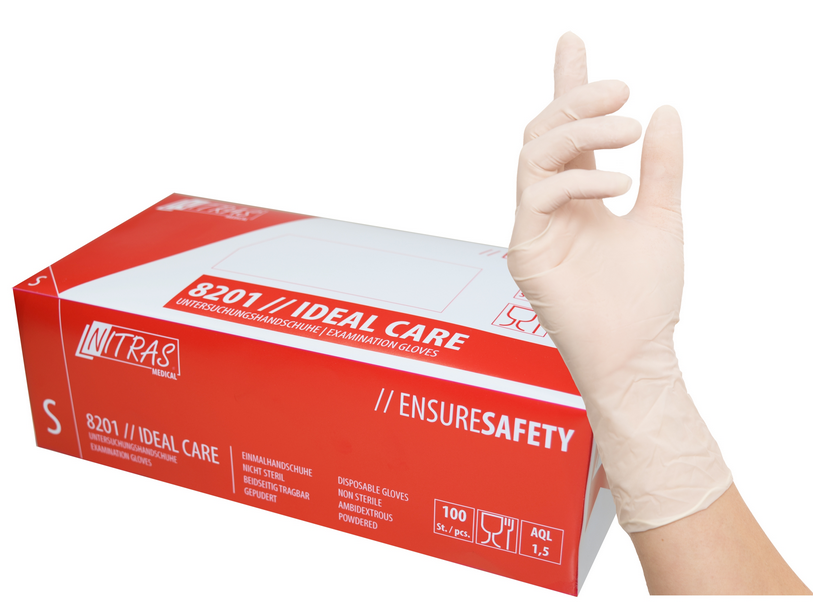 NITRAS IDEAL CARE, Latex-Einmalhandschuhe, naturfarben (Farbcode: 1100), unsteril, Rollrand, gepudert, hergestellt nach EN 455, für Lebensmittelkontakt, beidseitig tragbar (linke und rechte Hand), medizinische Handschuhe, mikrogeraute Oberfläche, Farbleitsysten für Größen, AQL 1,5, Box à 100 Stück.