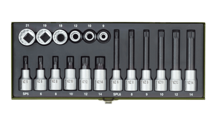 Für Motor (Zylinderkopf), Gelenkwellen, Hinterachsen. Für 1/2"-Vierkantantrieb (12,5 mm). Schraubereinsätze von 5 - 14 mm in normaler Version (55 mm) und von 6 - 14 mm in extralanger Version (100 mm). Dazu von außen fassende 12-kant Einsätze 9 - 21mm.