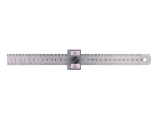 Teilung Oberkante 1/2 mm, Unterkante 1 mm geätzt. Anschlag aus Kusto, stufenlos verstellbar, mit Metallrändelschraube und Andruckfeder für rechtwinklige Justierung.